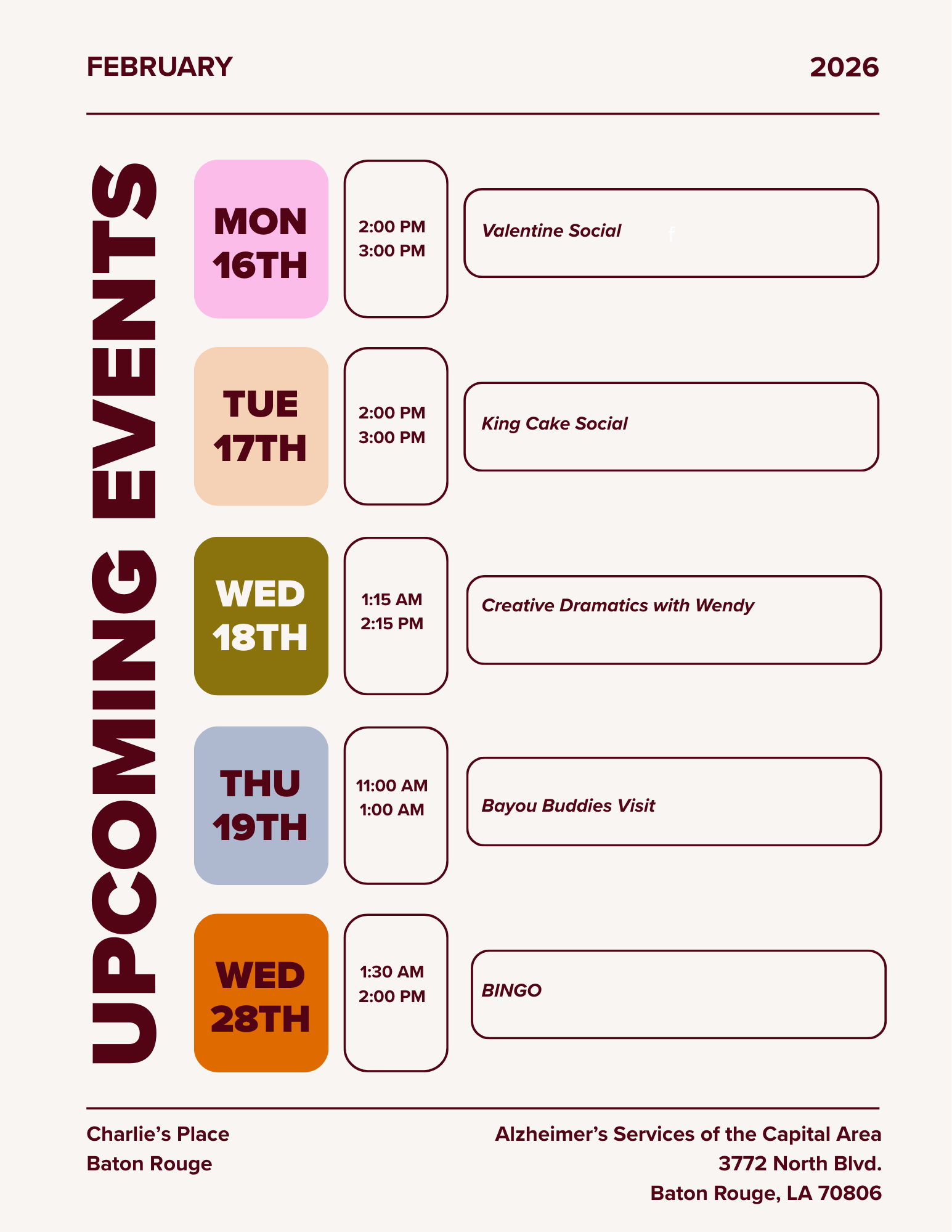 If you are interested in enrolling in the Baton Rouge, Gonzales, or Baker centers, please contact Alzheimer’s Services at (225) 334-7494.